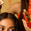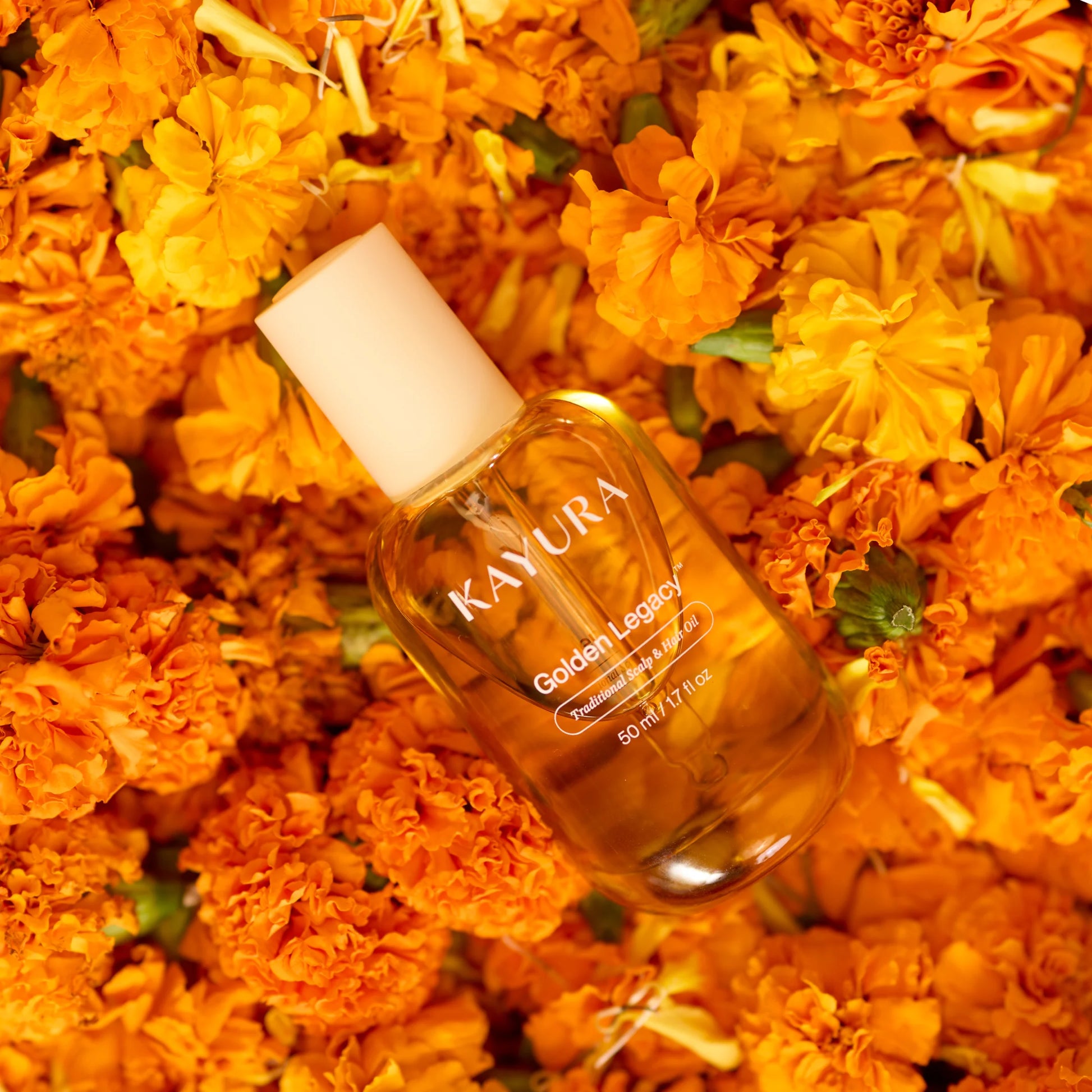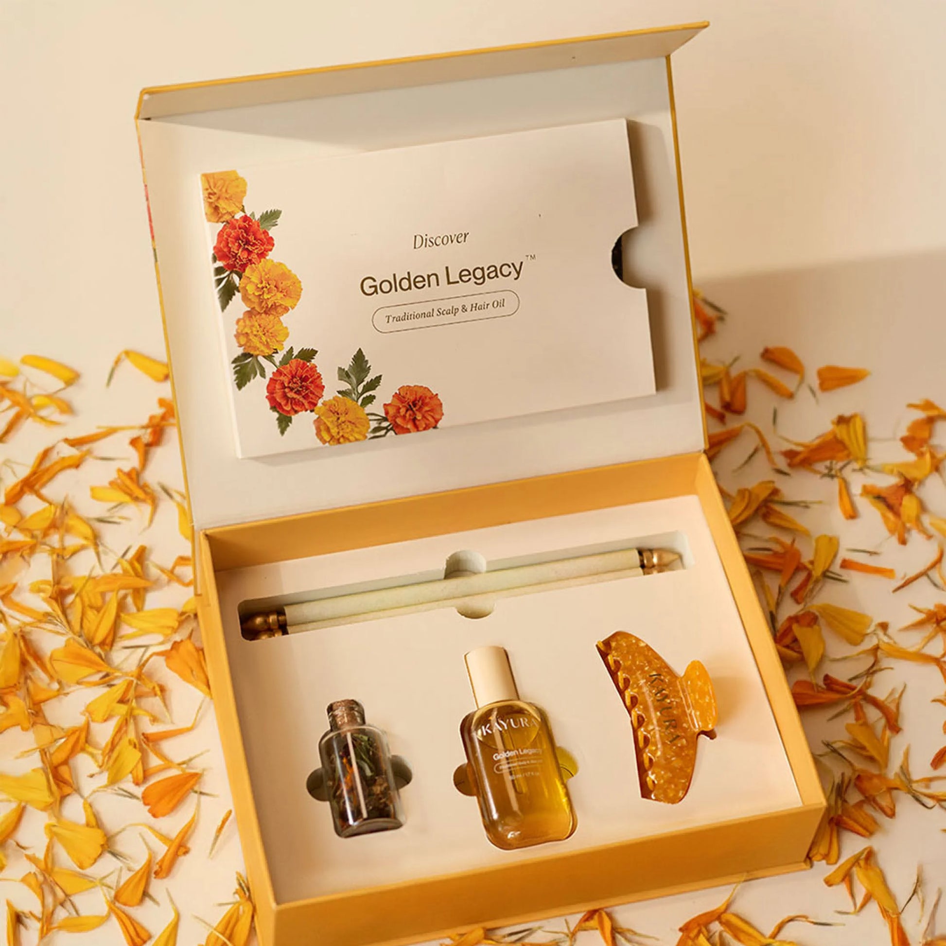 At its heart is our Golden Legacy™ Scalp & Hair Oil, a lightweight blend of coconut, almond, castor, and sesame oils, slow-infused for 30 days with 21 potent botanicals. Its rich golden hue comes from marigold, and it nourishes deeply to target thinning at the root while taming frizz, leaving hair smoother, stronger, and radiantly glossy.