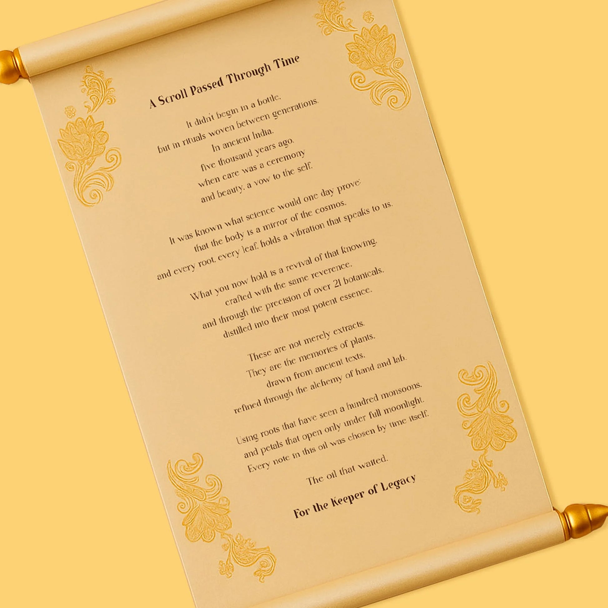 Legacy Scroll – A Scroll Passed Through Time, carrying the journey from ancient rituals & sacred botanicals to the oil you hold today. Free Shipping on orders over $50.